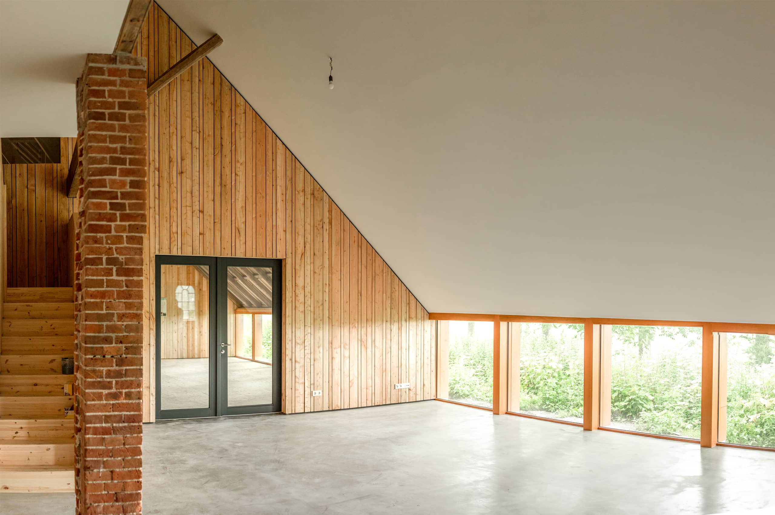 Alles doen vanuit respect voor het gebouw. Dat is eigenlijk het credo van waaruit deze boerderijen zijn gerestaureerd en verbouwd. Ook als het gaat om de woonhuizen in de schuur. Jan Harm: Om zo’n woonhuis te creëren, is het natuurlijk makkelijker om de houten gebinten die de hoofdstructuur vormen in de schuur weg te halen. Maar dat wil je niet. Die hoofdconstructie is heel oud. Het maakt ook dat zo’n schuur een kathedraalachtige uitstraling krijgt. Het zijn namelijk drie-beukige schuren, waarbij de hoge middenbeuk vroeger diende voor de opslag en het dorsen van de oogst, de lage zijbeuk de grupstal voor de koeien vormde en de andere zijbeuk bedoeld was als opslag van wagens. We hebben daarom van de woningen een soort doos-in-doos constructie gemaakt. Het concept is daarmee het succes van de eenvoud. En we bouwen op een plek waar het weinig afbreuk doet aan het geheel.