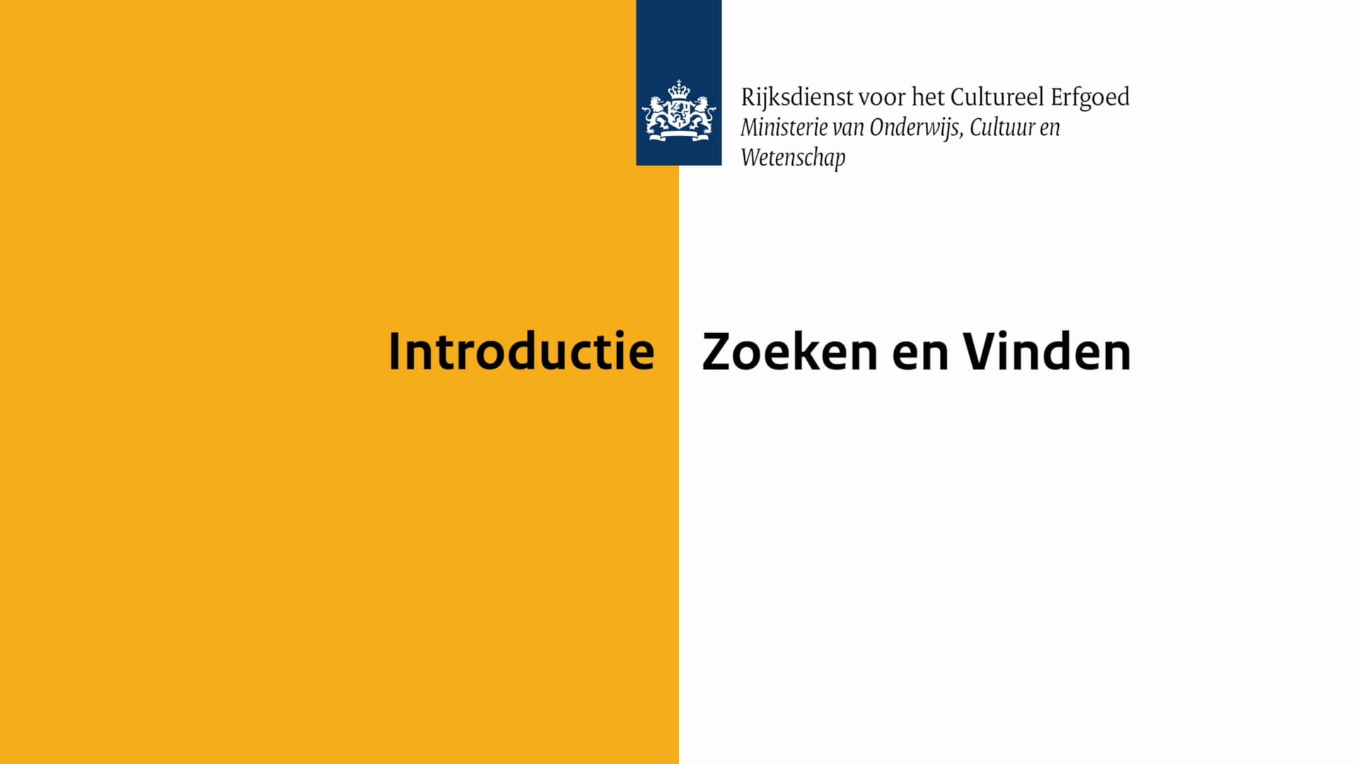 [Logo Rijksoverheid. Rijksdienst voor het Cultureel Erfgoed. Ministerie van Onderwijs, Cultuur en Wetenschap. Introductie Zoeken & Vinden.]